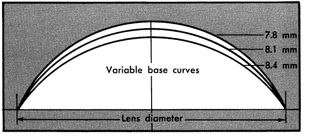 The combination of these two curved structures (Fig. 7) makes the fitting of a lens a difficult task. In the early years of contact lens development, the problem was circumvented by molding the anterior segment of the eye with rubber-like dental impression material and then forming the glass lens over a dental stone positive of the eye. Only the most skilled craftsmen were able to make lenses that provided good visual acuity. Unfortunately, the wearing time of the lens was limited to 3 to 4 hours.