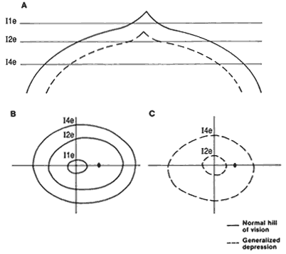 In manual perimetry, diffuse depression is manifested by contraction of the isopters. The isopters retain their normal contour. The most central isopters may disappear entirely as the peak of the island of vision sinks (Fig. 16).