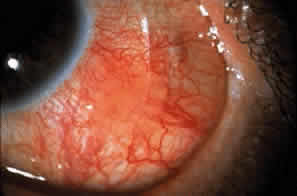 Conjunctival or corneal bullae have been described10 but are rarely observed, perhaps because they rupture readily because of the blinking action of the eyelids. Breakdown of the corneal epithelium most commonly results from entropion with trichiasis; lagophthalmos with abnormal blinking and exposure; and a diminished, unstable tear film. These erosions may become complicated by secondary bacterial infiltrates and ulcers. Predisposing factors for the development of microbial keratitis include topical corticosteroids, bandage contact lenses, trichiasis, corneal surgery, lagophthalmos, and meibomianitis.12 Corneal neovascularization may develop either as a pannus or pseudopterygium. Smears of conjunctival scrapings from patients with CP reveal neutrophils, keratinized squamous cells, and eosinophils.13 In a study of the bacterial flora of patients with CP, potential pathogens—mainly mannitol-positive staphylococci—were recovered from the eyelids and conjunctiva of 81% of patients with this disease.2 Glaucoma may be more prevalent in patients with CP.14 COURSE OF OCULAR DISEASE Cicatricial pemphigoid generally runs a chronic course, characterized by progressive shrinkage of the conjunctiva. When the end stage of this disease is reached, the eye lacks tears and has obliterated conjunctival fornices, ankyloblepharon, and a keratinized ocular surface epithelium. Episodes of acute disease activity may interrupt this chronic progressive course and result in rapid shrinkage of the conjunctiva.15 Acute disease activity may be precipitated by surgical procedures, including conjunctival biopsy, lysis of symblepharon, oculoplastic procedures on the eyelids, and cataract extraction. The acute manifestations consist of localized, ulcerated conjunctival mounds (Fig. 4) or diffuse, severe conjunctival hyperemia and edema (Fig. 5). Before concluding that acute inflammatory activity is caused by the disease process, it is necessary to eliminate other confounding factors such as trichiasis, exposure, or bacterial blepharoconjunctivitis.