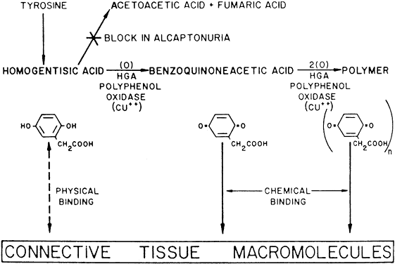 Tissue pigmentation (ochronosis) is not caused by the presence of homogentisic acid, which is bound physically to the connective tissue macromolecules, but rather by the chemical binding in the tissues of alternative pathway by-products resulting from the failure to remove homogentisic acid in a normal manner. These by-products are benzoquinoacetic acid and polymers of this compound. The production of both benzoquinoacetic acid and its polymers depends on the presence of the homogentisic acid polyphenol oxidase, which is present in the skin and cartilage of mammals. Once deposited, these polymers are indistinguishable from melanin (Fig. 2).3
