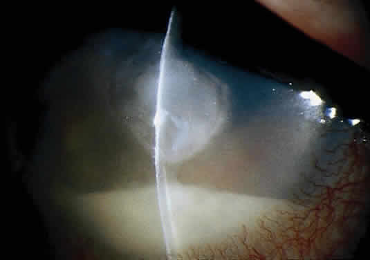 Fig. 6. Streptococcus viridans corneal ulcer in a young woman wearing cosmetic soft contact lenses. The ulcer is well defined and dry in appearance with only a minimal anterior chamber reaction.