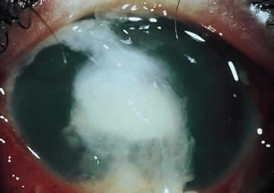 Fig. 5. Large, disk-shaped corneal ulcer caused by Streptococcus pneumoniae in an elderly woman. The presence of a sterile hypopyon is often associated with these ulcers.