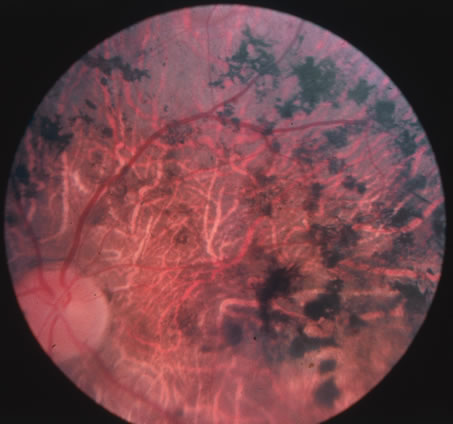 The diagnosis of Lyme disease is made by clinical presentation and serology. It is, however, appropriate to treat based on clinical findings and a history of a known exposure. CDC recommendations for serologic testing include an ELISA followed by a Western blot. Antibodies are often present for years after exposure to infection, regardless of treatment of the disease. Therefore, seropositivity must not be mistaken for active disease. Treatment recommendations for Lyme disease include a 2- to 3-week course of doxycycline, with substitution with amoxicillin for children and pregnant women.70 Patients with evidence of neurologic abnormalities should undergo a more intensive 2- to 4-week course of intravenous ceftriaxone. SYPHILIS Syphilis is a sexually transmitted disease caused by the bacterium Treponema pallidum. A primary skin lesion known as a chancre is followed 3 weeks to 6 months later by hematogenous dissemination of the organism, a stage known as secondary syphilis. Secondary disease manifestations are broad and nonspecific ranging from a maculopapular rash and generalized mucocutaneous lesions to malaise, fever, and painless lymphadenopathy. Less commonly gastrointestinal, hepatic, and renal disease have been reported. Secondary syphilis generally resolves within months but may recur, often within the same year. Late sequelae involving the central nervous system and the aorta is referred to as the tertiary stage of syphilis. Approximately 30% of untreated patients develop tertiary syphilis, but less than 1% develop clinical signs of neurosyphilis. Neurosyphilis can result in a cerebral vasculitis producing symptoms of transient ischemia or infarction, general paresis, or chronic encephalitis producing progressive dementia and tabes dorsalis. Tabes dorsalis is a progressive spinal cord lesion involving the posterior columns and dorsal nerve roots resulting in the classic broad-based foot slapping gait. The average interval from infection to central nervous system involvement is 5 to 10 years for meningovascular disease, 20 years for general paresis, and 25 to 30 years for tabes dorsalis. Progression to neurosyphilis may be accelerated in patients with AIDS.71 The clinical manifestations of congenital syphilis are as broad as those of acquired syphilis. The first sign is often rhinitis, followed by mucocutaneous lesions resembling secondary syphilitic disease in adults. Inflammatory skeletal lesions are common, as are lymphadenopathy, hepatosplenomegaly, jaundice, anemia, thrombocytopenia, and leukocytosis. Neonatal death may occur from pulmonary hemorrhage, secondary bacterial infections, or severe hepatitis. Stigmata include widely spaced peg-shaped teeth (Hutchinson's teeth), frontal facial bossing, saddle nose, maxillary hypoplasia, saber shins, and linear scarring around body orifices known as rhagades. Ocular involvement may occur in all three stages of syphilis. Conjunctival chancre formation may occur in primary syphilis. Nonspecific conjunctivitis, episcleritis and scleritis may occur in secondary syphilis. Syphilitic interstitial keratitis is usually associated with congenital infection but may also be acquired. Iritis, dilated iris capillaries, iris nodules, and chorioretinitis including the classic salt-and-pepper pigmentary degeneration of the fundus seen in congenital disease (Fig. 20).72 Acute syphilitic posterior placoid chorioretinitis in association with HIV positivity describes fundus findings of large solitary placoid yellowish lesions at the level of the pigment epithelium.73 Neuroophthalmic findings include cranial nerve involvement and Argyll-Robertson pupils occur in all cases of general paresis and often with tabes dorsalis. A recent review of 552 patients over a 5-year period noted that syphilis was a more common etiology of uveitis than had been previously reported with 4.3% incidence.74
