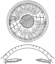 Partial-Thickness Corneal Lacerations Corneal lacerations that appear to be nonperforating must be examined carefully to rule out any rupture of Descemet's membrane. Seidel testing with 2% fluorescein should be performed to check for microscopic leaks. Gentle digital pressure may reveal a self-sealing wound. Such self-sealing wounds may be a result of stromal swelling when tears and aqueous come into contact with raw stroma. If the injury is indeed full thickness, treatment strategy is notably affected whereas partial thickness injuries may be treated on an outpatient basis, full-thickness lacerations are at risk for endophthalmitis and hospitalization with intravenous antibiotic usage may be considered. The goals in treating partial thickness corneal lacerations include preventing infection and promoting re-epithelialization and stromal healing. Every effort is made to minimize scarring and surface irregularity. If the wound edges are in good apposition with no wound gape, pressure patching with the use of prophylactic topical antibiotics is sufficient. Re-epithelialization is usually rapid. If the wound is unstable, a bandage soft contact lens may be used to support the wound and encourage re-epithelialization by minimizing the traumatic effect of lid movement (Fig. 2). Topical antibiotic prophylaxis, as well as cycloplegia for comfort, is used while the lens is in place. The lens should remain in place until wound healing is stable and complete re-epithelialization has occurred. Full-Thickness Corneal Lacerations BANDAGE SOFT CONTACT LENS. For small, self-sealing corneal perforations, a bandage contact lens may be sufficient to protect and support the wound as it heals. Such lacerations include nondisplaced, beveled, self-sealing wounds. If aqueous leakage persists for more than 24 hours or there is progressive shallowing of the anterior chamber, more definitive treatment should be undertaken. Treatment with a bandage contact lens in children should be done only with extreme caution and close follow-up care. In cases that respond satisfactorily, the contact lens should be kept in place until the wound has stabilized (usually 3–6 weeks). A protective shield should be worn at all times. Topical antibiotic prophylaxis and cycloplegia are recommended with the lens in place. TISSUE ADHESIVE. Cyanoacrylate tissue adhesive has been successfully used by ophthalmologists for many years despite not being approved by the U.S. Food and Drug Administration. Tissue adhesive is particularly useful for puncture wounds with small amounts of central tissue loss and selected small lacerations.4 Tissue adhesive should be applied to a dry, deepithelialized bed. A capillary microapplicator or fine-gauge disposable needle is used to apply a very thin film of adhesive over the site (Fig. 3). Alternatively, adhesive may be applied using a sterile 2- to 4-mm polyethylene or silicone disc affixed to the end of an applicator stick with sterile ophthalmic ointment. The disc may be left in place or removed with care. Three to five minutes are required for polymerization of the adhesive. A bandage soft contact lens is applied for comfort and to prevent the glue from dislodging. While the contact lens is in place, a prophylactic antibiotic drop is administered. Over time, the tissue adhesive dislodges spontaneously as the wound surface reepithelializes. Alternatively, it may be gently removed with forceps after adequate stromal healing has occurred. SUTURE REPAIR OF SIMPLE CORNEAL LACERATIONS. Most lacerating anterior segment injuries require the placement of corneal sutures. The primary goal of corneal suturing is to achieve a watertight wound. Secondary goals include minimizing scarring, restoring normal anatomic relationships, and reconstructing the normal corneal topographic contours. Local anesthesia may be used in selected cases. General anesthesia is used for more severe injuries or with an uncooperative patient, unless medically contraindicated. The affected eye is aseptically prepared and draped with caution to avoid any unnecessary pressure on the globe. To stabilize or manipulate the globe, 6-0 silk stay sutures may be placed at the limbus, 90 degrees away from the wound. Rectus bridle sutures may be passed as well, again taking care to avoid any pressure on the globe. If the anterior chamber is formed and the wound is watertight, sutures may be placed directly without entering the anterior chamber with instrumentation. For a wound that is less stable, a viscoelastic may be irrigated into the anterior chamber either directly through the wound itself or through a separate limbal paracentesis incision (Fig. 4). This will aid in re-forming the anterior chamber, tamponade intraocular contents, and protect the corneal endothelium, iris, and lens. Balanced salt solution or air may also be used to re-form the anterior chamber. In most cases, a limbal paracentesis is preferred because it will minimize disruption of the wound edges and permit better access as the case proceeds.5 A 15-degree sharp microsurgical knife or MVR blade may be used to create the paracentesis, placing the incision 90 degrees away from the wound. If a very shallow or flat anterior chamber is present, extreme care should be taken to avoid damage to the iris or lens when constructing the paracentesis site.