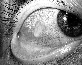 Chapter 7: Uveal Tract & Sclera II. SCLERA BLUE SCLERAS The normal sclera is white and opaque, so that the underlying uveal structures are not visible. Structural changes of the scleral collagen fibers and thinning of the sclera may allow the underlying uveal pigment to be seen, giving the sclera a bluish discoloration. Blue scleras also occur in several disorders that lead to disturbances in the connective tissues, such as osteogenesis imperfecta, Ehlers-Danlos syndrome, pseudoxanthoma elasticum, and Marfan's syndrome (Chapter 15). Blue scleras are sometimes noted in normal newborn infants and in patients with keratoconus or keratoglobus. SCLERAL ECTASIA Prolonged elevation of intraocular pressure early in infancy, as may occur with congenital glaucoma, can lead to stretching and thinning of the sclera. Scleral ectasia may also occur as a congenital anomaly surrounding the disk or involving the macular area or following inflammation or injury of the sclera. STAPHYLOMA Staphyloma results from bulging of the uvea into ectatic sclera. It may be anterior, equatorial, or posterior. Anterior staphylomas are generally located over the ciliary body (ciliary staphyloma) (Figure 7-10) or between the ciliary body and the limbus (intercalary staphyloma). Equatorial staphylomas are located at the equator and posterior staphylomas posterior to the equator. Posterior staphylomas are most commonly seen near the optic nerve head. Patients with posterior staphyloma generally have poor vision and high myopia, though cases of congenital peripapillary staphyloma in patients with normal or nearly normal vision have been reported. Posterior staphyloma usually produces choroidal atrophy and may be associated with subretinal neovascularization. Staphyloma must be differentiated from extreme myopia and central coloboma of the optic nerve head. INTRASCLERAL NERVE LOOPS OF AXENFELD The intrascleral nerve loops are sites of branching of the long ciliary nerves. They enter the sclera close to the ciliary body, usually 3-4 mm posterior to the limbus. They are more commonly seen nasally, tend to be pigmented, and are usually accompanied by a small anterior ciliary artery. INFLAMMATION OF THE EPISCLERA & SCLERA Inflammation involving the episclera, the thin layer of vascularized connective tissue overlying the sclera, is referred to as episcleritis. Scleritis, in contrast, refers to primary inflammation of the sclera itself. Scleritis tends to be much more painful and is more often associated with an underlying systemic infection or autoimmune disease. 1. EPISCLERITIS Episcleritis is a relatively common localized inflammation of the vascularized connective tissue overlying the sclera. It tends to affect young people, typically in the third or fourth decade of life; affects women three times as frequently as men; and is unilateral in about two-thirds of cases. Recurrence is the rule. The cause is not known. An associated local or systemic disorder, such as ocular rosacea, atopy, gout, infection, or collagen-vascular disease, is present in up to one-third of patients. Symptoms of episcleritis include redness and mild irritation or discomfort. Ocular examination reveals episcleral injection, which may be nodular, sectoral, or diffuse (Figure 7-11). There is no inflammation or edema of the underlying sclera, and keratitis and uveitis are uncommon. Conjunctivitis is ruled out by the lack of palpebral conjunctival injection or discharge. The condition is benign, and the course is generally self-limited in 1-2 weeks. In the absence of a systemic disease, associated treatment should include chilled artificial tears every 4-6 hours until the redness resolves. However, for cases associated with a local or systemic disorder, more specific therapy may be needed-eg, doxycycline, 100 mg twice daily for rosacea; antimicrobial therapy for tuberculosis, syphilis, or herpesvirus infection; or local or systemic nonsteroidal anti-inflammatory agents or cortico-steroids for collagen-vascular disease. 2. SCLERITIS Scleritis is an uncommon disorder characterized by cellular infiltration, destruction of collagen, and vascular remodeling. These changes may be immunologically mediated or, less commonly, the result of infection. Local trauma can precipitate the inflammation (Table 7-7). Laboratory studies are often helpful in identifying associated systemic diseases, which occur in up to two-thirds of patients (Table 7-8). Scleritis is bilateral in one-third of cases and affects women more commonly than men, typically in the fifth or sixth decades of life. Patients with scleritis almost always complain of pain, which is typically severe and boring in nature and tends to wake them at night. The globe is frequently tender. Visual acuity is often slightly reduced, and intraocular pressure may be mildly elevated. Concurrent keratitis or uveitis occurs in up to one-third of patients. A key clinical sign is deep violaceous discoloration of the globe due to dilation of the deep vascular plexus of the sclera and episclera, which may be nodular, sectoral, or diffuse (Figure 7-12). Use of the red-free filter of the slitlamp highlights the vascular changes. Areas of avascularity usually result from an occlusive vasculitis and portend a poor prognosis. Scleral thinning often follows bouts of inflammation. Scleral necrosis in the absence of inflammation is referred to as scleromalacia perforans, and is seen almost exclusively in patients with rheumatoid arthritis. Posterior scleritis usually presents with pain and decreased vision with little or no redness. Mild vitritis, optic nerve head edema, serous retinal detachment, or choroidal folds may be present. Diagnosis is based on detection of thickening of the posterior sclera and choroid on ultrasonography or computed tomography (CT) scan. Localized thickening may be mistaken on ultrasonography for a choroidal tumor. The same disease associations described above for episcleritis also occur with scleritis, tho